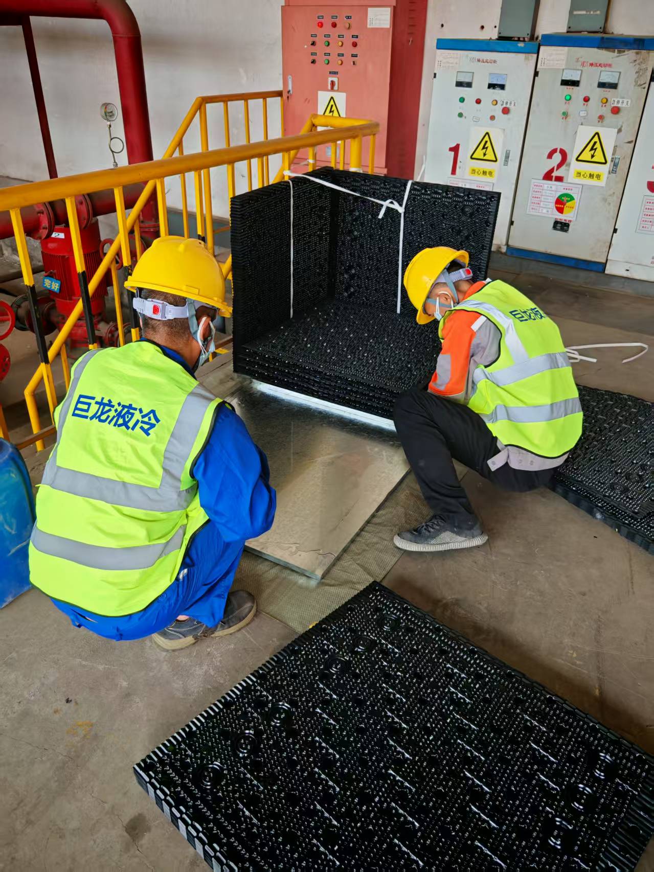 四川地區填料更換施工遵循“拆除-清理-安裝-驗收”標準化流程。在拆除階段,關閉電機電源后拆除填料拉筋,采用高壓水槍與硬毛刷逐塊清洗舊填料,目測水垢脫落情況直至填料表面還原本色。如冷凍一期4#冷卻塔因水質差導致填料脫落,施工團隊在塔內潮濕環境中連續作業24小時,清理污泥浸透的舊填料,確保無殘留雜質。